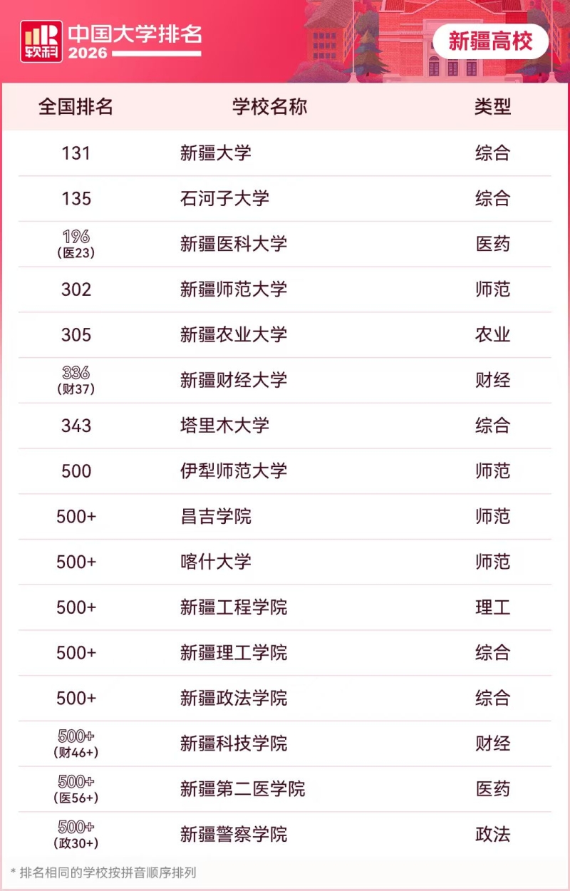 石榴云/新疆日报讯(记者 赵西娅报道)4月15日,2026软科中国大学排名发布,今年新疆共有16所高校上榜,其中11所高校跻身主榜,即综合性大学排名,5所高校上榜单科性大学排名。