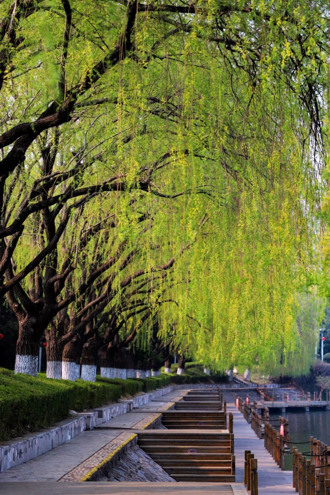 人沿着柳岸漫步