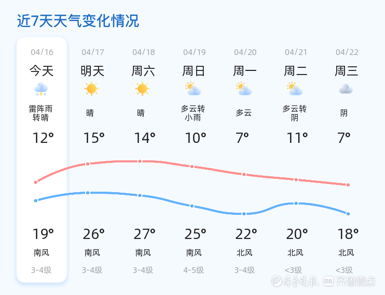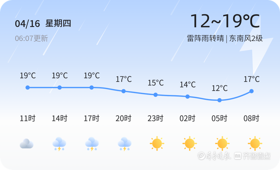今天是4月16日,星期四,农历二月廿九。聊城迎来雷阵雨转晴的天气,气温在12℃至19℃之间,东南风2级,空气湿度为74%,PM2.5指数为62,空气质量良好。今天全市各区均以雷阵雨转晴天气为主,市民出行需携带雨具并注意防范雷电。