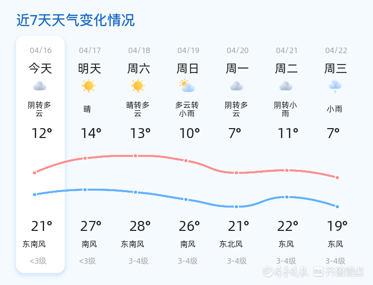 今日是4月16日(星期四),农历二月廿九。枣庄市今日天气为阴转多云,早晨气温较低,最低气温12℃,最高气温可达21℃。风力较小,东风2级,相对湿度50%。整体来看,枣庄各区天气状况基本一致,均为阴转多云,白天气温逐渐回升,市民出行请注意适时增减衣物。