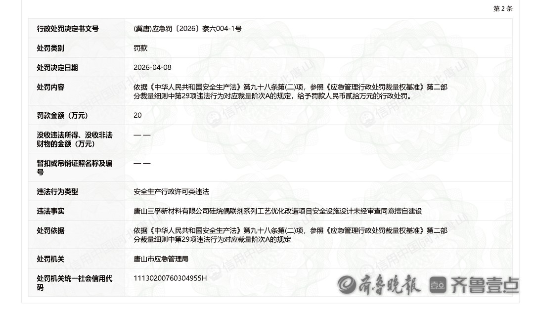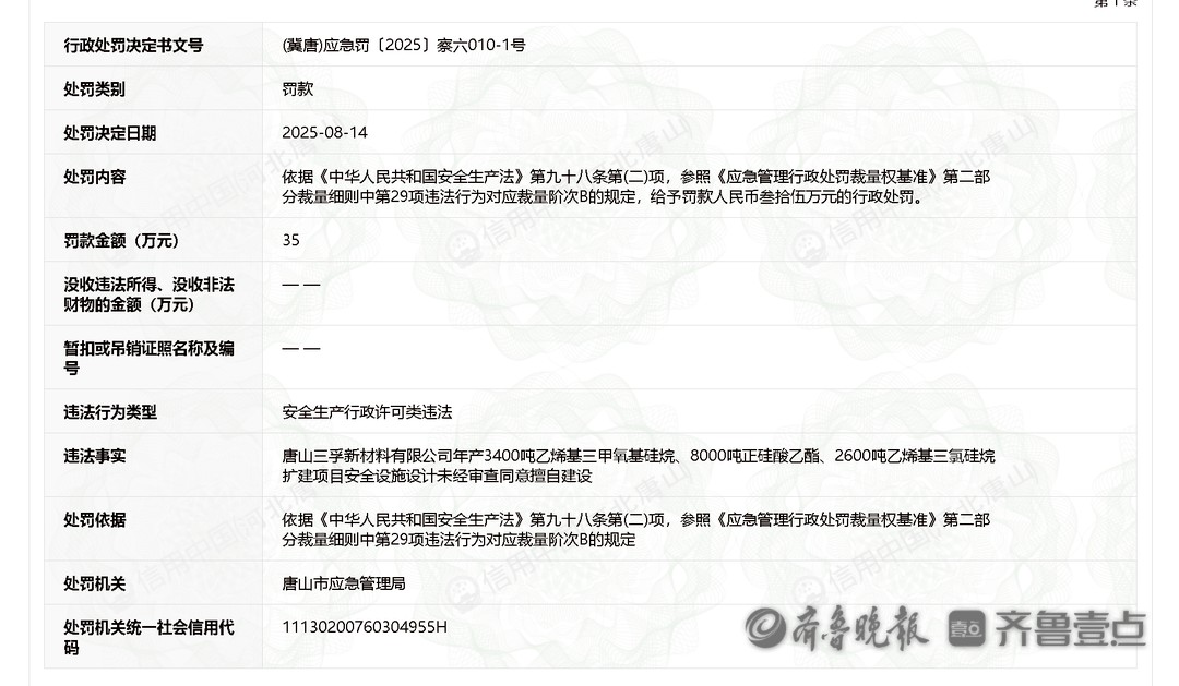 唐山三孚新材料有限公司硅烷偶联剂系列工艺优化改造项目安全设施设计未经审查同意擅自建设,唐山市应急管理局对其处罚款20万元。
