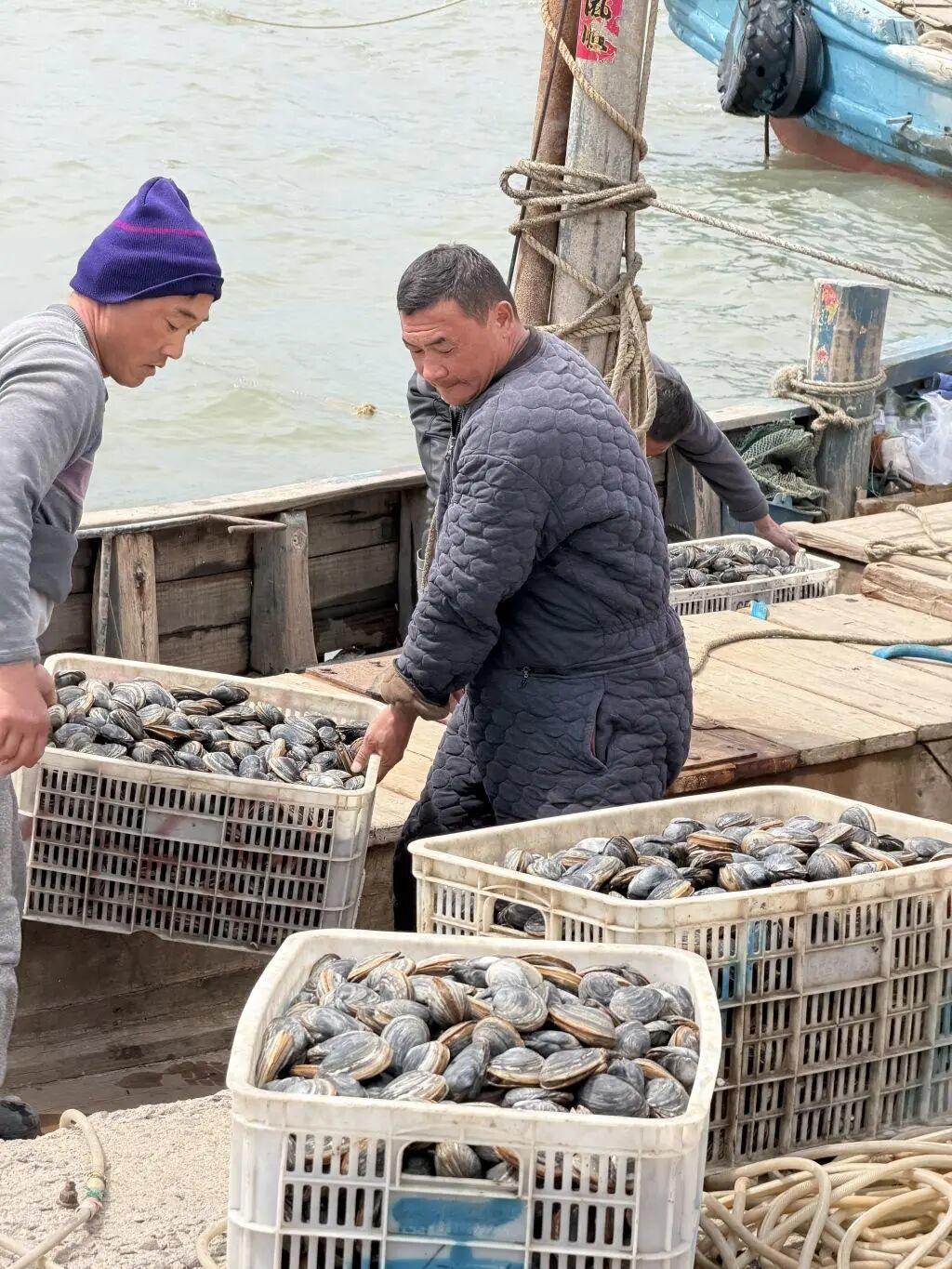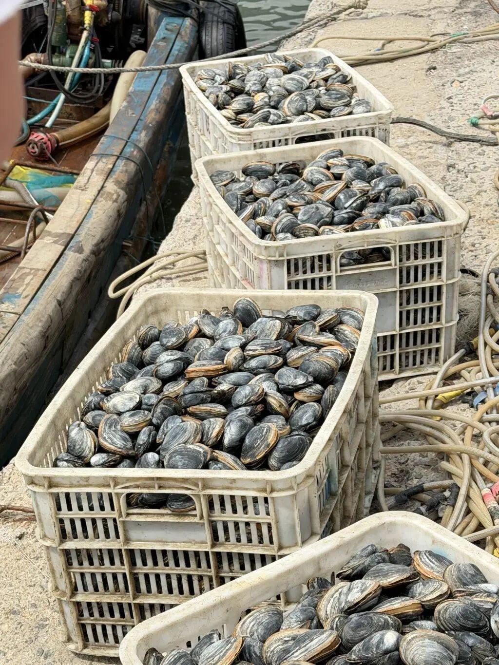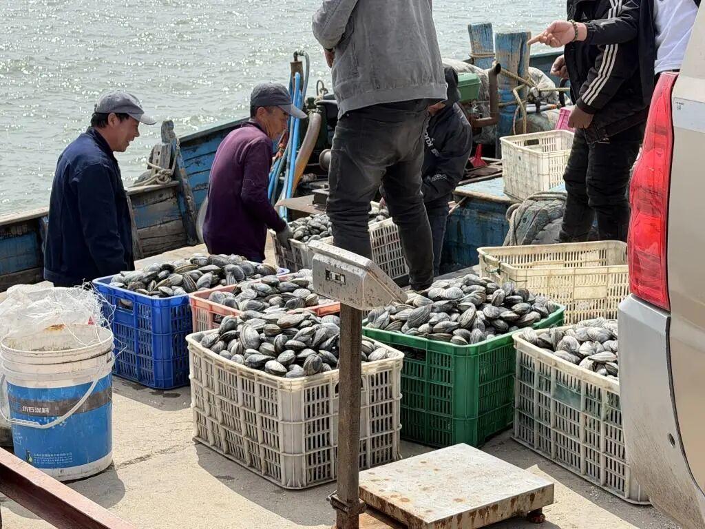 在红岛渔港码头,一艘艘渔船整齐停靠,渔民们正忙着将一筐筐带着海水潮气的蚬母从船舱搬运上岸。塑料筐里,蚬母外壳带着深海的灰褐纹理,在阳光下泛着湿润的光泽,刚出水的鲜活劲儿扑面而来。称重台前,收购商与渔民现场核对重量、洽谈交易,一派热闹的渔市景象。