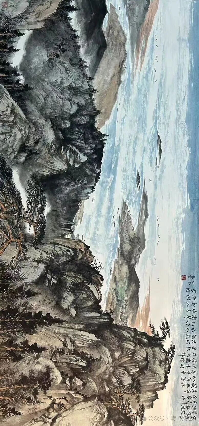 充星,本质上是我们老家人的性情,更觉质朴,谦卑,低调,他是内热的。他从小源于喜欢而迷恋画画,孜孜以求,艰难探索。在他身上有一种乐与众人相拥又经常喜欢独处的感觉。好的山水画家,既重生活历练滋养,又重在自然山水中静悟探寻,还重在书诗文化中沉淀淬炼,一样也缺不了,开悟思想,拓展情怀,提升境界。大自然,既令人充满敬畏与热爱,又给人以无限启迪。心灵与天地万物互动幻化万象奇景。崂山,这片神奇山海,云雾茫茫,山峰奇峻,海天辽阔,一方山水养一方人,充星,是这片水土滋养而生的画家,所以他的崂山山水画作品,更是他生活生命的写照,画出了灵魂。作为一个土生土长的崂山人,我能感受那独特的气势、气质,他的很多作品,格局、胸怀很大,不染尘埃,只恋山水之静美。(唐公子)