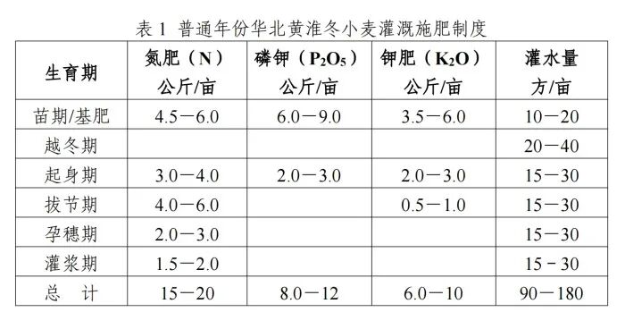 1.华北黄淮及汾渭平原冬麦区。小麦全生育期施氮(N)15-20公斤/亩,磷(P2O5)8-12公斤/亩,钾(K2O)6-10公斤/亩。全生育期一般灌水6次,每次灌水量15-30方/亩,灌溉定额每亩约90-180方。在起身、拔节、孕穗和灌浆期,分4次随水追肥,追肥以尿素、尿素硝铵、硝基氮肥、磷酸一铵、硫酸钾、氯化钾等水溶性肥料为主,推荐使用含氨基酸、腐植酸水溶肥料和中微量元素肥料,促蘖强根培育大穗。普通年份冬小麦灌溉施肥制度可参考表1。