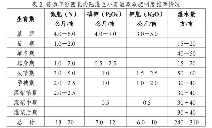 2.西北内陆灌溉麦区。一般全生育期灌水8次(包括出苗水),灌溉定额240-310方,随水施肥6次。高产小麦全生育期每亩氮肥(N)推荐施用量为13-20公斤,磷肥(P2O5)为7-12公斤,钾肥(K2O)为6-10公斤。普通年份灌溉施肥制度可参考表2。