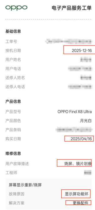 “当时主要是导航条部分有残影,我买这个手机主要是看好拍照功能,但是担心换屏拆机可能会导致镜头进灰影响拍照,就没有及时送去维修”,直到2025年12月该手机续航也出现严重问题,张先生才送去当地OPPO授权服务中心门店检测维修。工作人员检测电池容量为额定容量的80%-85%,状态无异常,认定仅屏幕存在烧屏故障后,为张先生更换了一块新屏幕。