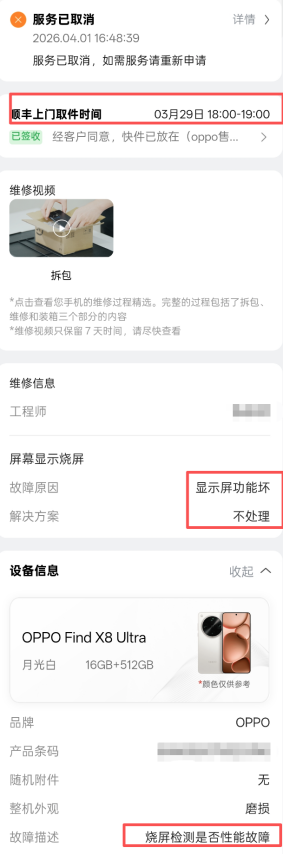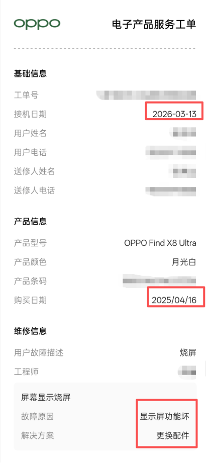 然而,仅十余天后,新屏幕又“烧了”。气愤之下,张先生当即向OPPO售后提出换机诉求。