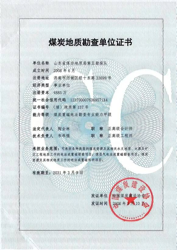 山东省煤田地质局五队获批煤炭重磁电法勘查甲级资质