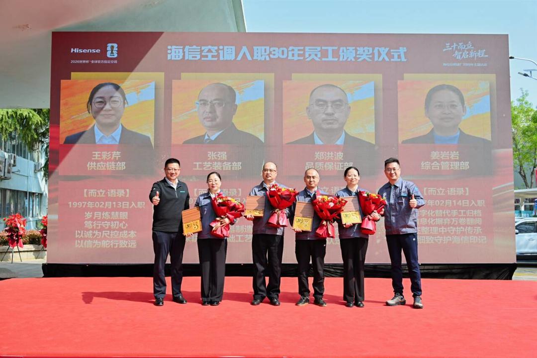 4月15日,海信空调“三十而立,智启新程”30周年庆典在海信家电产业园举行。庆典现场,企业为入职满30年的功勋员工举行授牌仪式,并组织退休职工参观厂区,共同回顾企业发展历程。同期举行的30周年主题春季越野赛与集体庆生活动,则以奔跑致敬奋斗,以欢聚凝聚温情,为庆典注入蓬勃向上的团队活力。