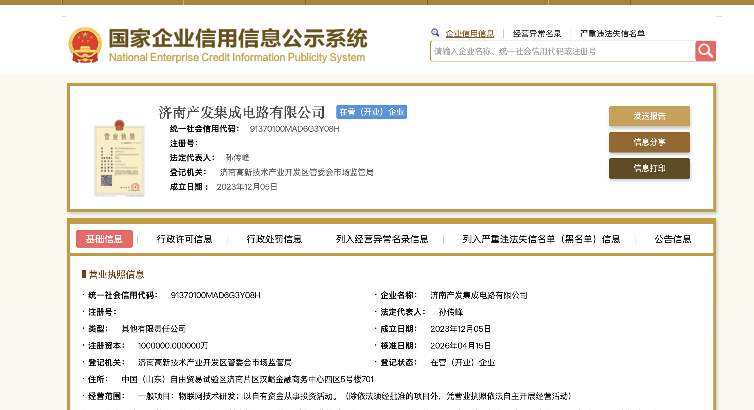 济南产发集成电路成立于2023年12月,注册资本100亿元,法定代表人孙传峰。股权穿透显示,济南工控进入后,济南产业发展投资集团、济南工控、济南财金信息技术产业投资有限公司三方分别持股40%、30%、30%。因济南产业发展投资集团为济南工控控股子公司,此次变动为济南工控内部资源整合。