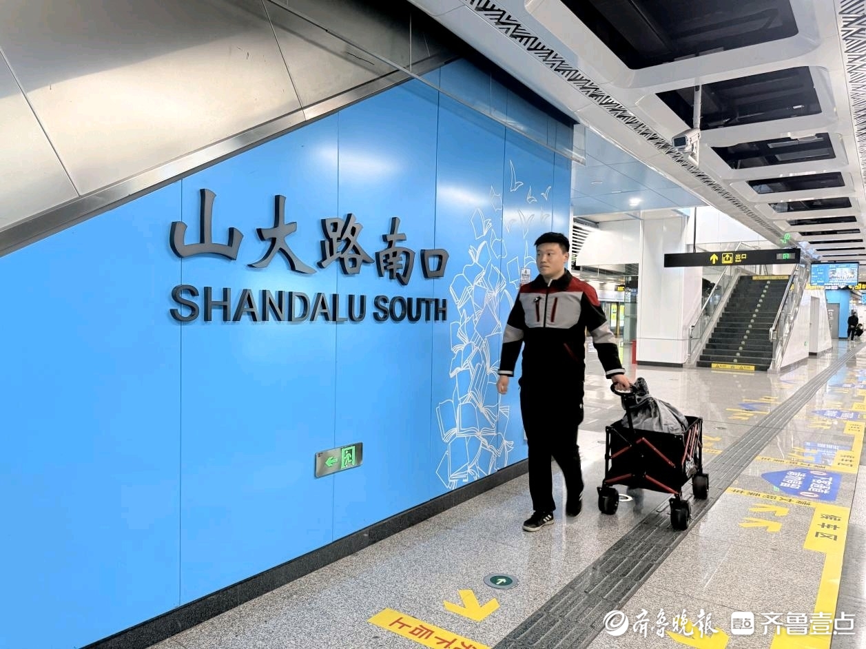 4月14日晚六点半,4号线山大路南口站客流逐渐平稳,一名快递员拉着一辆专用物流接驳车,从附近转运点走进车站,登上了前往汉峪金谷的列车。相关工作人员表示,“装卸过程会严格控制时间,不会延长列车停靠时间,也不影响正常发班。”