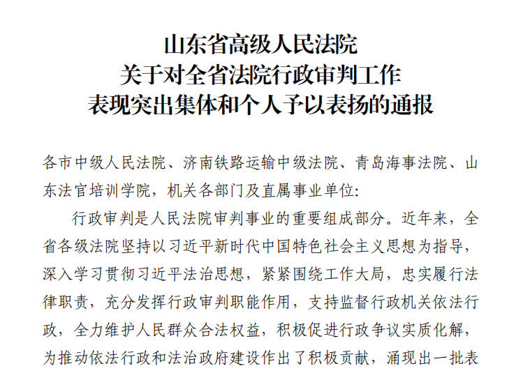 近日,山东省高级人民法院下发《关于对全省法院行政审判工作表现突出集体和个人予以表扬的通报》。淄博市博山区人民法院行政庭获评全省法院行政审判工作表现突出集体!博山法院行政庭(淄博市博山区人民法院)