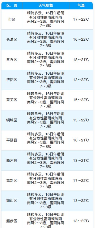 15日下午到16日白天,济南、泰安、鲁西北和鲁南地区天气多云转阴部分地区有雷雨或阵雨,其他地区天气晴转多云。南风,潍坊和半岛地区4级阵风5~6级,其他地区3级左右,雷雨地区雷雨时阵风7~9级。