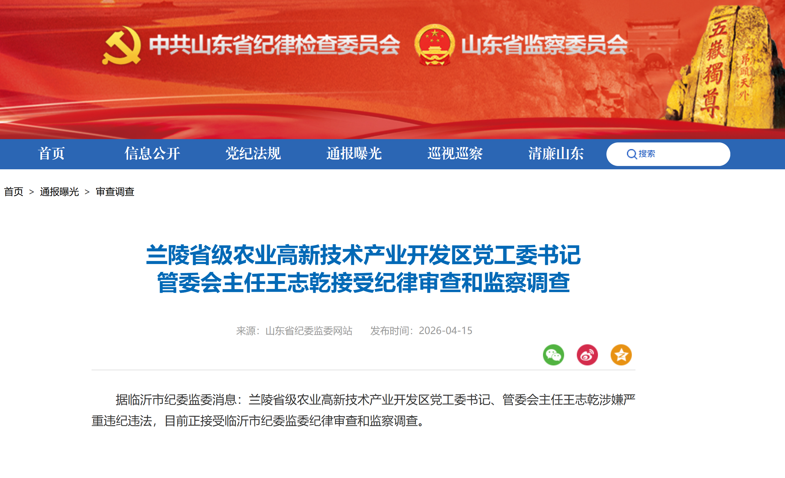 山东省纪委监委网站4月15日消息,兰陵省级农业高新技术产业开发区党工委书记、管委会主任王志乾涉嫌严重违纪违法,目前正接受临沂市纪委监委纪律审查和监察调查。