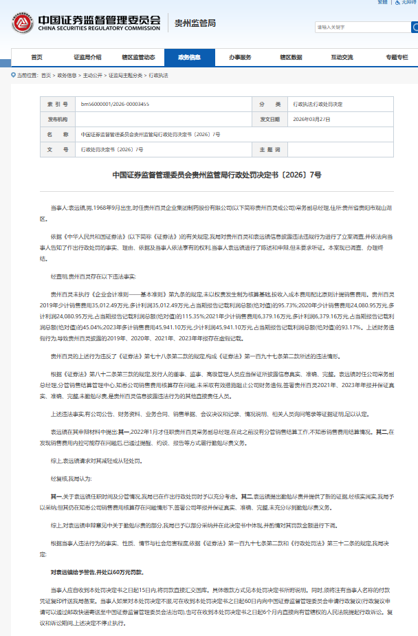 2026 年 3 月 27 日,中国证券监督管理委员会贵州监管局发布〔2026〕7 号行政处罚决定书,对贵州百灵企业集团制药股份有限公司(以下简称 “贵州百灵”)时任常务副总经理袁远镇信息披露违法违规行为作出处罚,决定对其给予警告,并处以 60 万元罚款。该案系贵州百灵四年财务造假系列处罚之一,再次彰显监管层对资本市场财务造假 “零容忍” 的坚定态度。