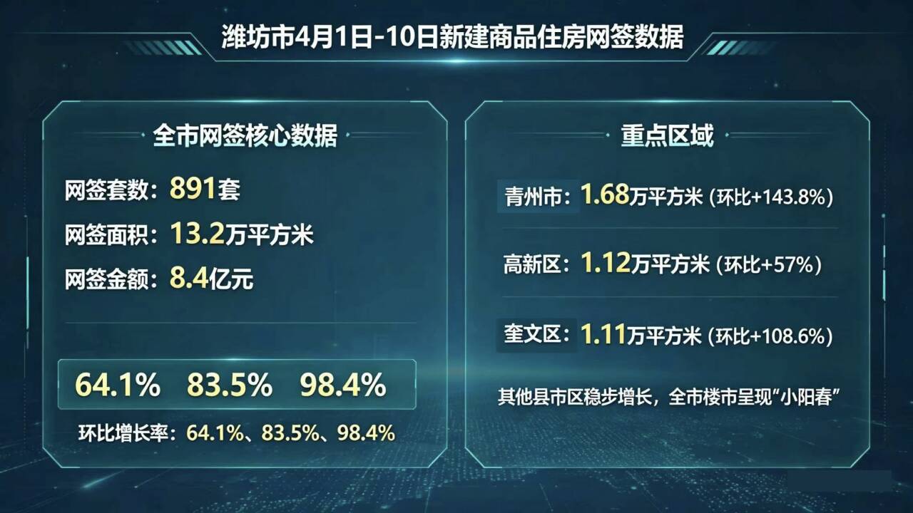 数据显示,4月上旬潍坊新建商品住房网签达891套,总面积13.2万平方米,总金额8.4亿元,环比分别增长64.1%、83.5%、98.4%,成交规模、面积、金额同步扩容,市场活跃度显著提升 。