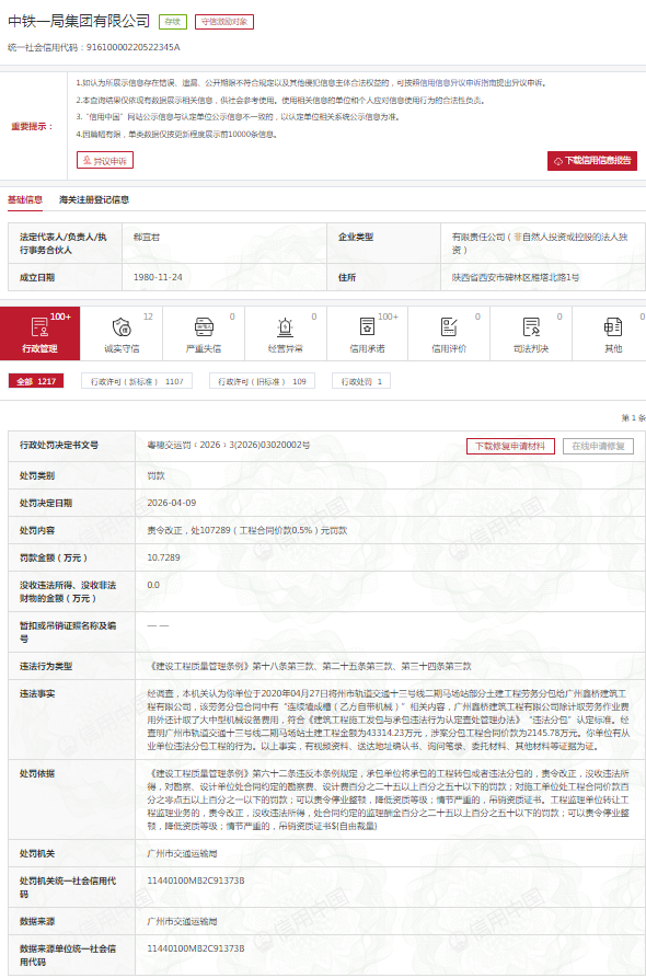 近日,信用中国公示了中铁一局集团有限公司的行政处罚决定。行政处罚决定书文号粤穗交运罚﹝2026﹞3(2026)03020002号显示,经调查,该单位于2020年4月27日将州市轨道交通十三号线二期马场站部分土建工程劳务分包给广州鑫桥建筑工程有限公司,该劳务分包合同中有“连续墙成槽(乙方自带机械)”相关内容,广州鑫桥建筑工程有限公司除计取劳务作业费用外还计取了大中型机械设备费用,符合《建筑工程施工发包与承包违法行为认定查处管理办法》“违法分包”认定标准。经查明广州市轨道交通十三号线二期马场站土建工程金额为43314.23万元,涉案分包工程合同价款为2145.78万元。该单位有从业单位违法分包工程的行为。