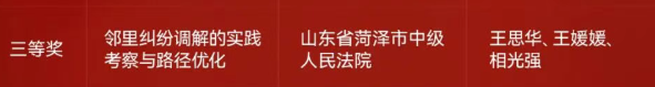 在“社会治理创新实践”赛道中,菏泽中院王思华、王媛媛、相光强团队提交的《邻里纠纷调解的实践考察与路径优化》,从司法实践出发,结合大数据分析,探索了基层邻里纠纷化解的创新路径,最终荣获三等奖。