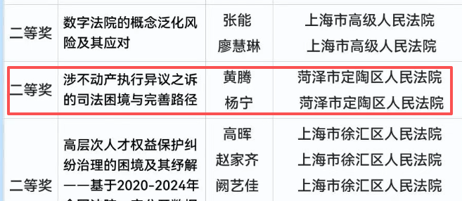 菏泽市定陶区人民法院黄腾、杨宁团队撰写的《涉不动产执行异议之诉的司法困境与完善路径》荣获科研与司法实务工作者组二等奖。