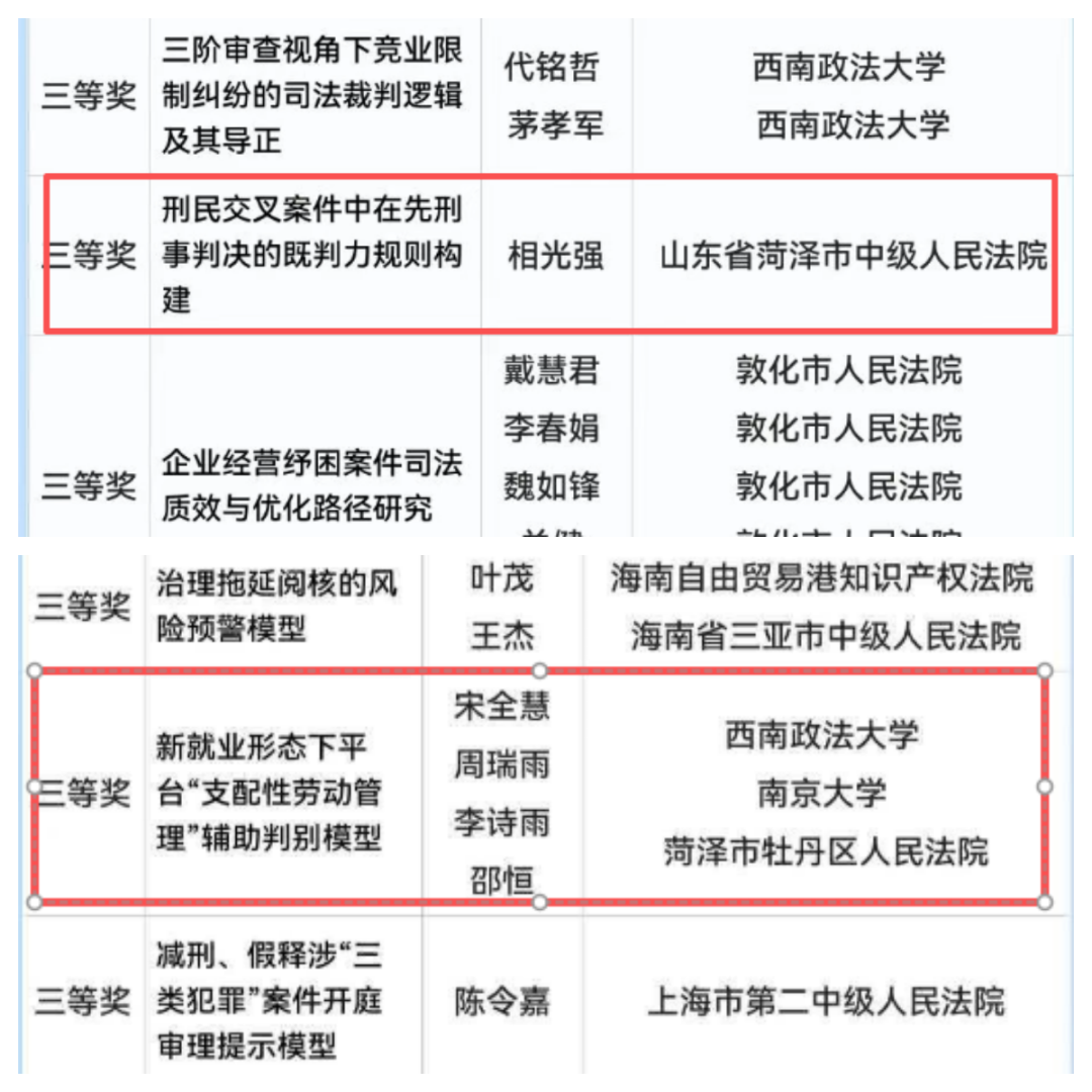 菏泽中院相光强撰写的《刑民交叉案件中在先刑事判决的既判力规则构建》荣获科研与司法实务工作者组三等奖。菏泽市牡丹区人民法院邵恒参与撰写的《新就业形态下平台“支配性劳动管理”辅助判别模型》荣获应用探索-模型智能应用组三等奖。