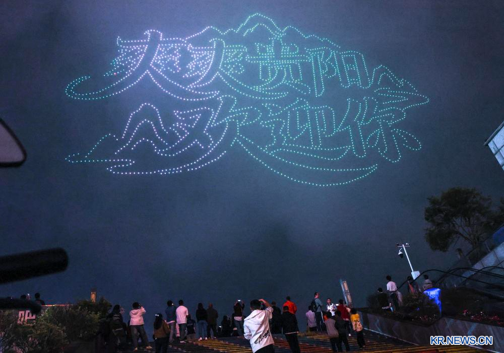 [신화망 중국 구이양 4월16일] 14일 밤 구이저우(貴州)성 구이양(貴陽)시 관산후(觀山湖)구에서 구이저우의 '과학기술+문화관광'을 주제로 한 드론 공연이 펼쳐졌다. 수천 대의 드론이 빠르게 성장하는 구이양의 빅데이터 산업과 풍부한 문화관광 자원을 입체적으로 그려냈다.
