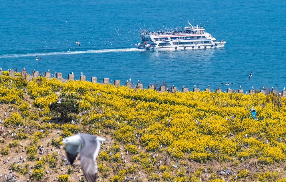 [신화망 중국 지난 4월16일] 산둥(山東)성 룽청(榮成)시 하이뤼다오(海驢島)가 노란 유채꽃으로 물들었다. 수만 마리의 괭이갈매기가 날아들어 이곳에 둥지를 틀었다. 아름다운 생태계가 그려낸 한 폭의 그림 같은 풍경을 보기 위해 많은 관람객이 유람선을 타고 하이뤼다오를 찾고 있다.