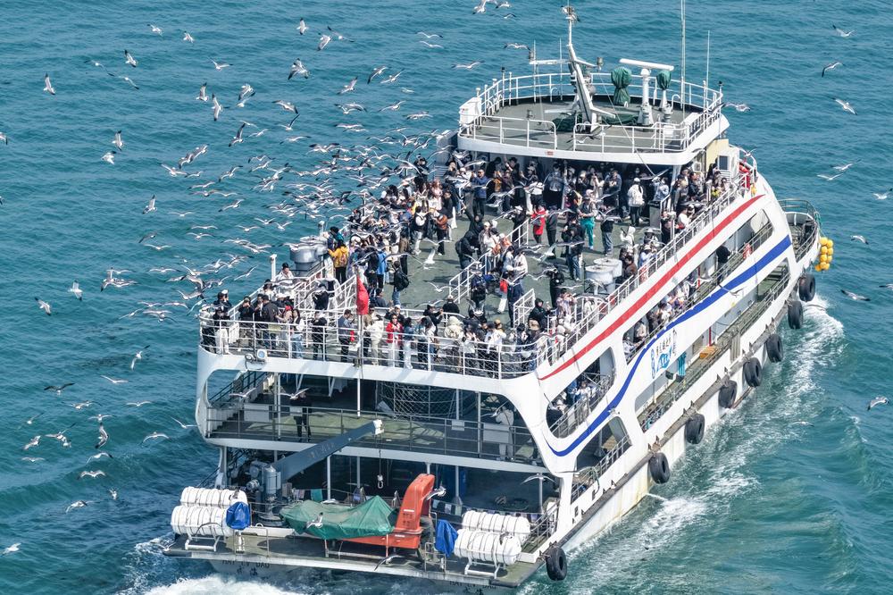 15일 산둥(山東)성 룽청(榮成)시 하이뤼다오(海驢島) 해역을 운항하는 유람선을 드론으로 내려다봤다.