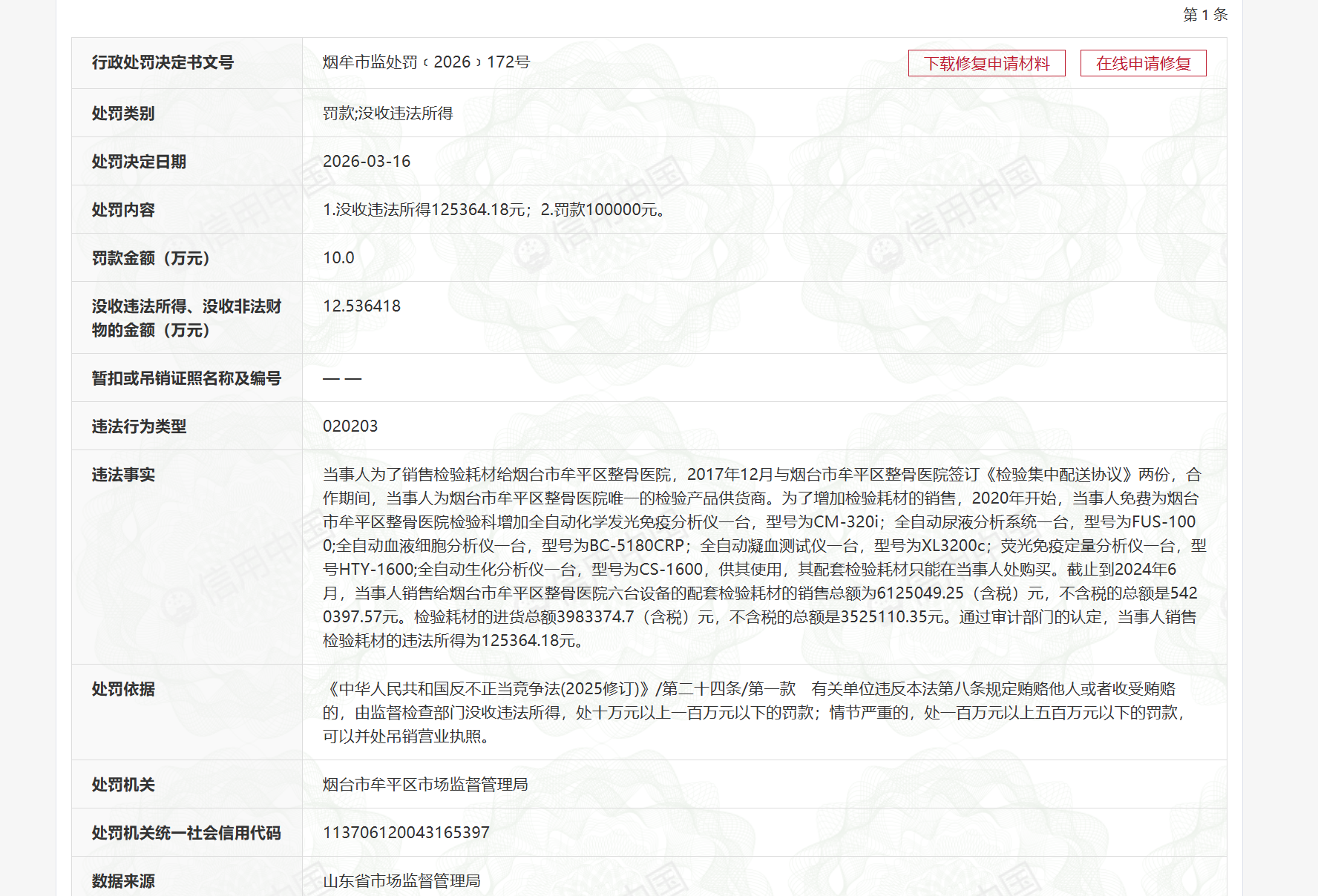 近日,信用中国公示的行政处罚信息显示,国内大型医药流通企业瑞康医药集团股份有限公司(股票代码:002589.SZ),因违反《中华人民共和国反不正当竞争法(2025修订)》,被烟台市牟平区市场监督管理局依法作出行政处罚:没收违法所得125,364.18元,罚款100,000元。