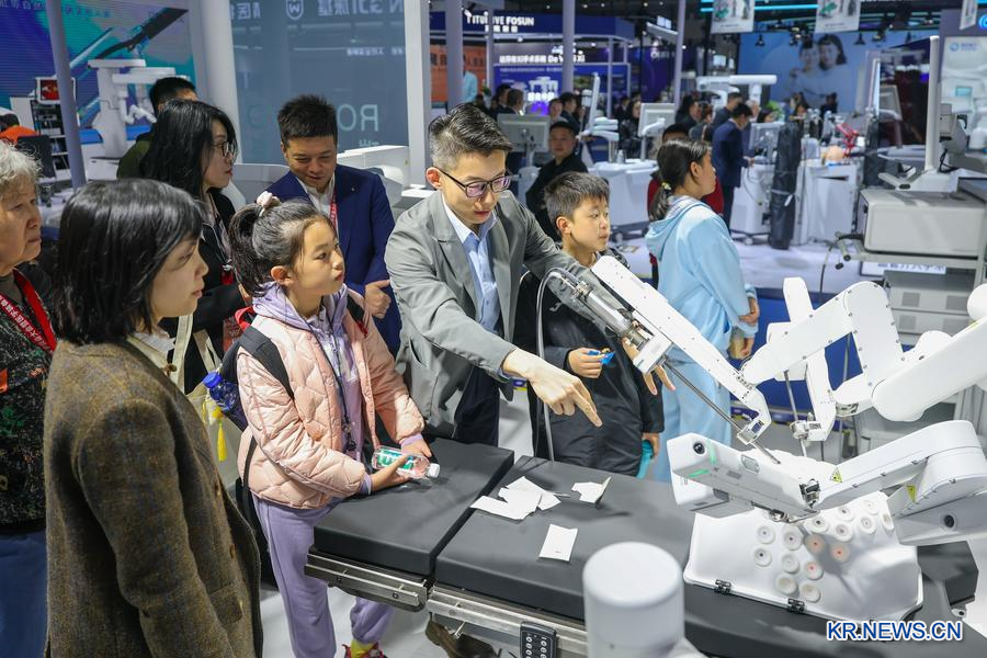 3월 29일 '2026 중국의학장비전시회'에서 한 직원이 방문객들에게 분리형 수술 로봇의 작동 원리를 설명하고 있다. (사진/신화통신)