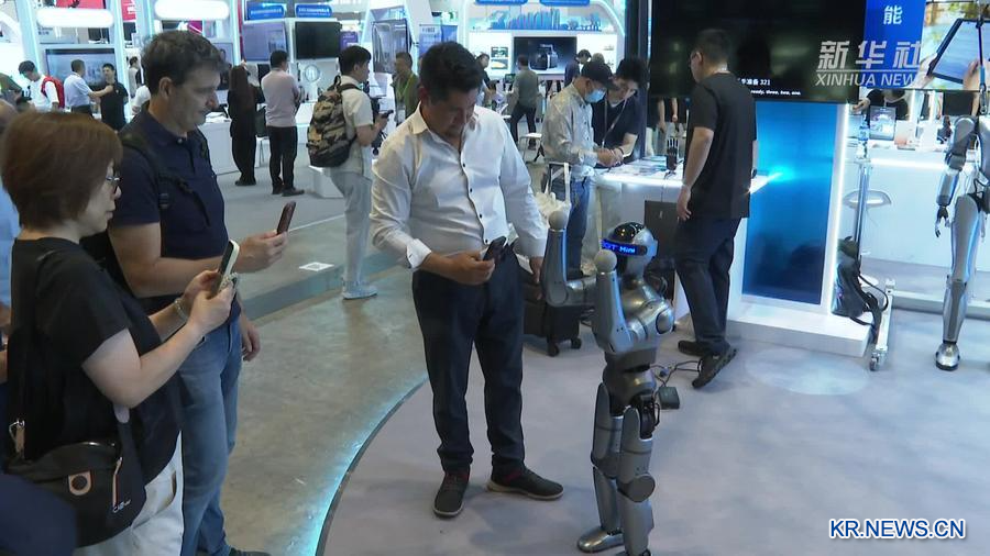 '홍콩 국제혁신과학기술전시회(이노엑스, InnoEX) 및 춘계 전자제품 페어'에 참석한 관람객들이 로봇을 휴대전화에 담고 있다. (영상캡처/신화통신)