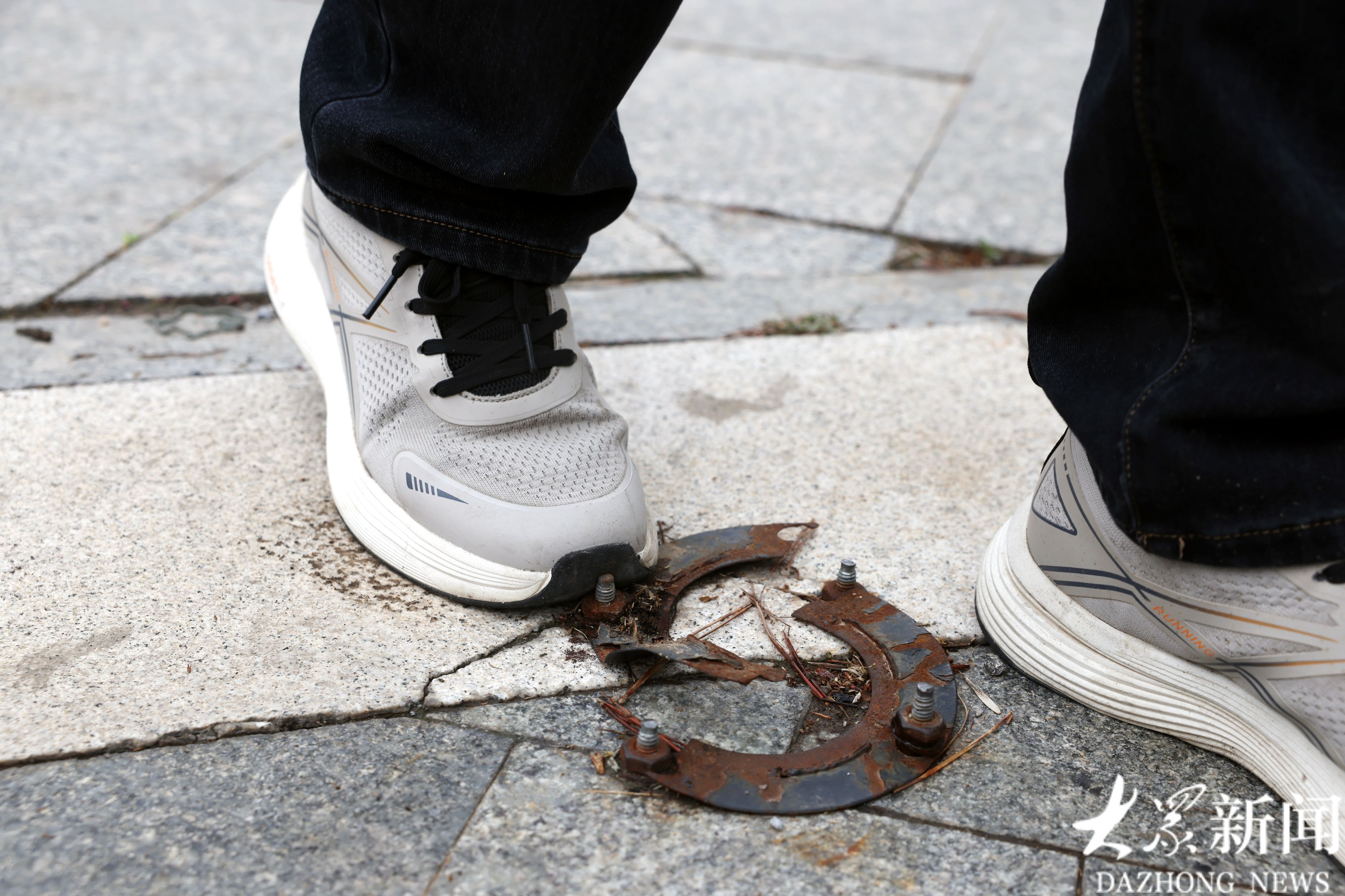 宋大哥用脚尖轻踢路面遗留的地钉,演示它如何给行人造成安全隐患。