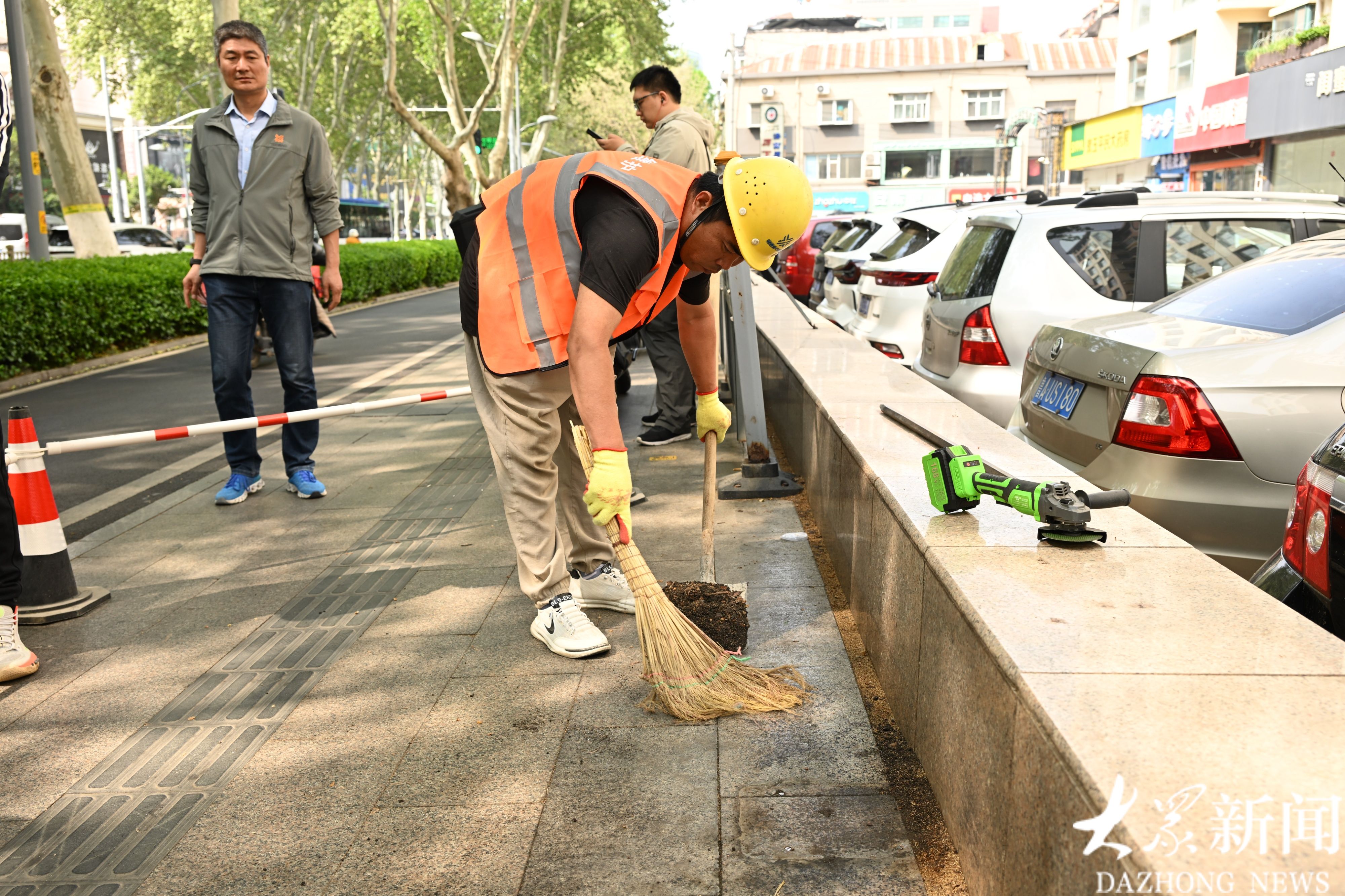 4月13日,济南市文化西路,清理路面地钉等遗留障碍物后,工作人员修补、清扫了破损路面。