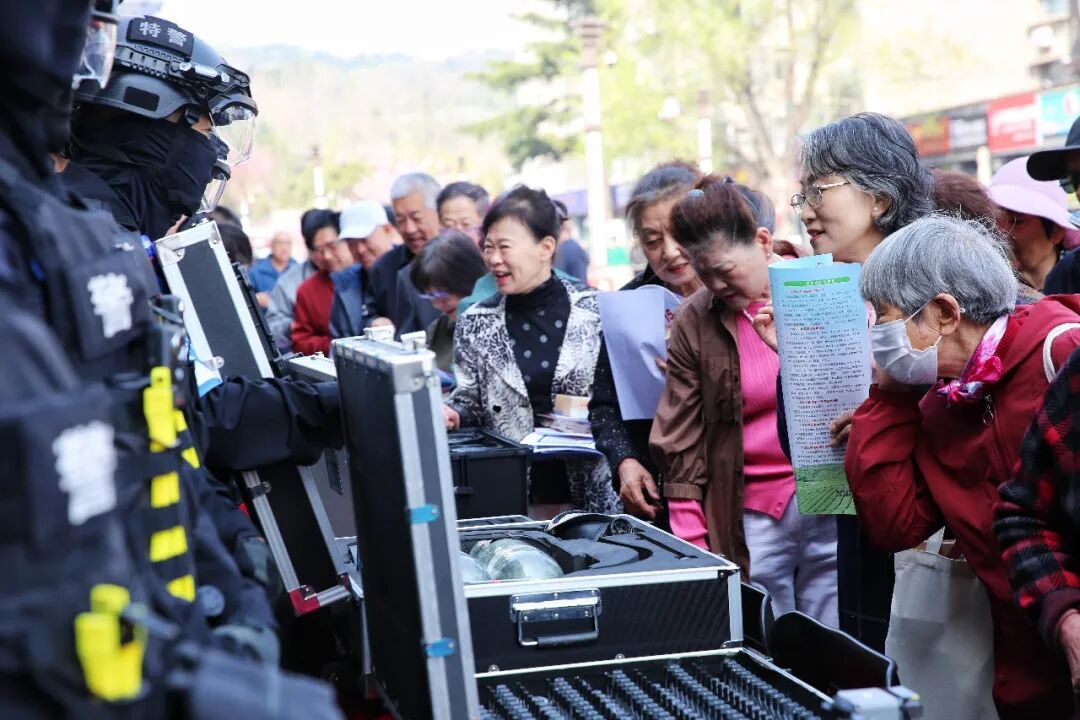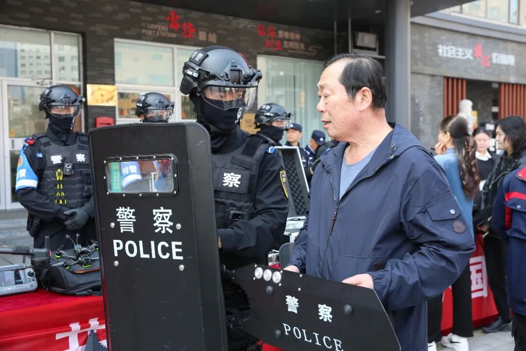 反恐装备展示区则成为现场最具吸引力的“打卡点”。威海市公安局环翠分局特巡警现场展示了防暴盾牌等各类专业防恐防爆装备,一边演示装备使用方法,一边细致讲解突发应急事件的处置流程和应对技巧,还主动邀请群众体验装备,直观感受公安队伍的专业能力。“有这么多专业装备和英勇的民警守护,我们的生活更安心、更踏实了!”居民王义威体验后,由衷发出赞叹。