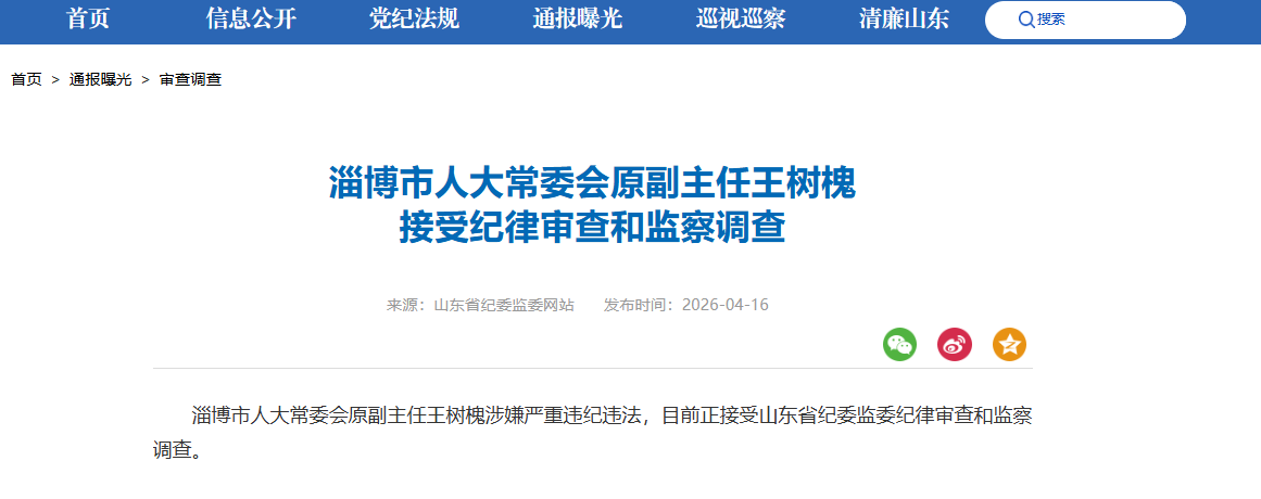 淄博市人大常委会原副主任王树槐被查打虎拍蝇猎狐 | 2026-04-16 19:17:26 微信扫码扫码下载客户端据山东省纪委监委网站4月16日消息,淄博市人大常委会原副主任王树槐涉嫌严重违纪违法,目前正接受山东省纪委监委纪律审查和监察调查。责任编辑:李思羽