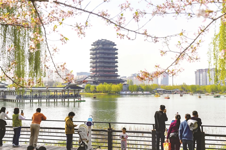 4月15日,市民在齐盛湖畔游玩赏花。春和景明,万木吐翠,正是踏青出游好时节。眼下,齐盛湖公园各种花卉竞相盛开,自然景色与远处的海岱楼相映成趣,吸引了众多市民前来休闲游玩。