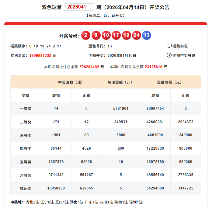 4月14日,福彩双色球第2026041期开奖,当期销售3.96亿元,筹集公益金1.42亿元;中出一等奖14注,单注奖金576.19万元,河北2注、辽宁6注,重庆、湖南、广东、四川、陕西、深圳各1注;中出二等奖171注,单注奖金24.95万元;除此之外,三等奖、四等奖、五等奖、六等奖,共中出1140.69万注;大家喜爱的“福运奖”,中出1085.89万注,“福运奖”奖金合计超过5429万元。其中,山东中得“福运奖”62.95万注。