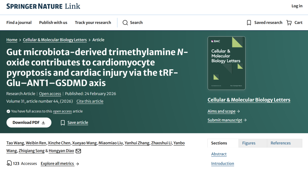 近日,济南微生态生物医学省实验室教授刁宏燕、助理研究员王涛团队在《Cellular & Molecular Biology Letters》期刊在线发表题为“Gut microbiota-derived trimethylamine N-oxide contributes to cardiomyocyte pyroptosis and cardiac injury via the tRF-Glu-ANT1-GSDMD axis”的研究论文。该研究揭示了菌群代谢物激活tRF-Glu-ANT1-GSDMD信号轴的调节机制在细胞炎症性死亡的关键作用,为开发针对菌群靶向治疗策略提供新的视角。济南微生态生物医学省实验室为该论文第一完成单位。