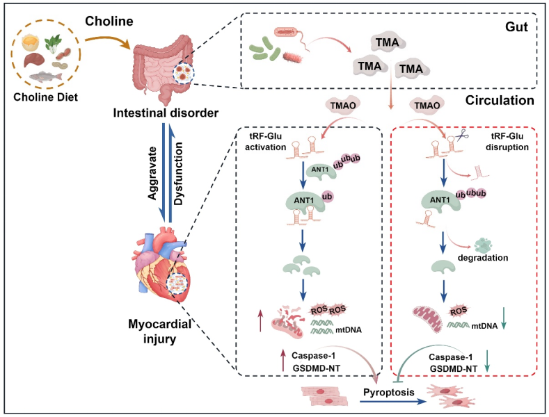 研究团队揭示了tRF-Glu 通过抑制ANT1泛素化过程,进而激活GSDMD表达和mtDNA的释放,参与心肌细胞焦亡的调节。这一发现确立了TMAO/tRF-Glu/ANT1信号轴在“肠-心”互作中的关键干预靶点,为心肌损伤的预防和治疗开辟了新的思路。
