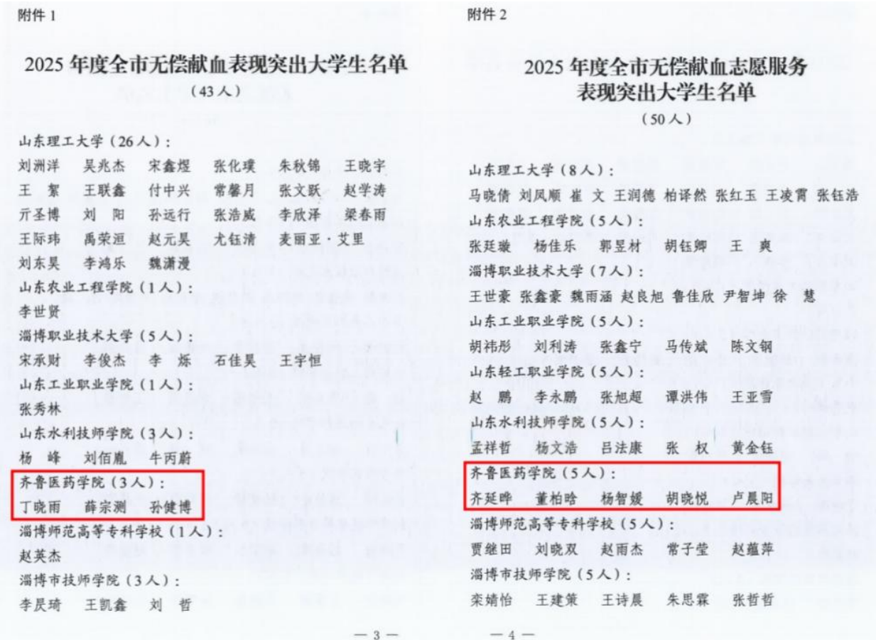 近日,淄博市卫生健康委员会、中共淄博市委社会工作部、中共淄博市委教育工委、共青团淄博市委、淄博市红十字会联合印发《关于表扬2025年度全市无偿献血及志愿服务表现突出大学生的通报》,齐鲁医药学院8名学子获表彰。