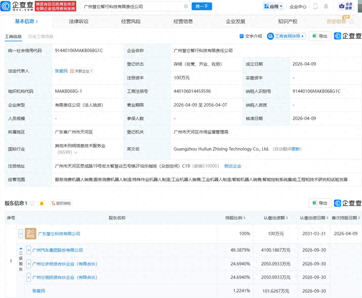 企查查APP显示,近日,广州慧仑智行科技有限责任公司成立,法定代表人为张爱民,经营范围包含:服务消费机器人销售;服务消费机器人制造;特殊作业机器人制造;工业机器人制造等。企查查股权穿透显示,该公司由广东慧仑科技有限公司全资持股,后者由广汽集团等共同持股。(企查查)