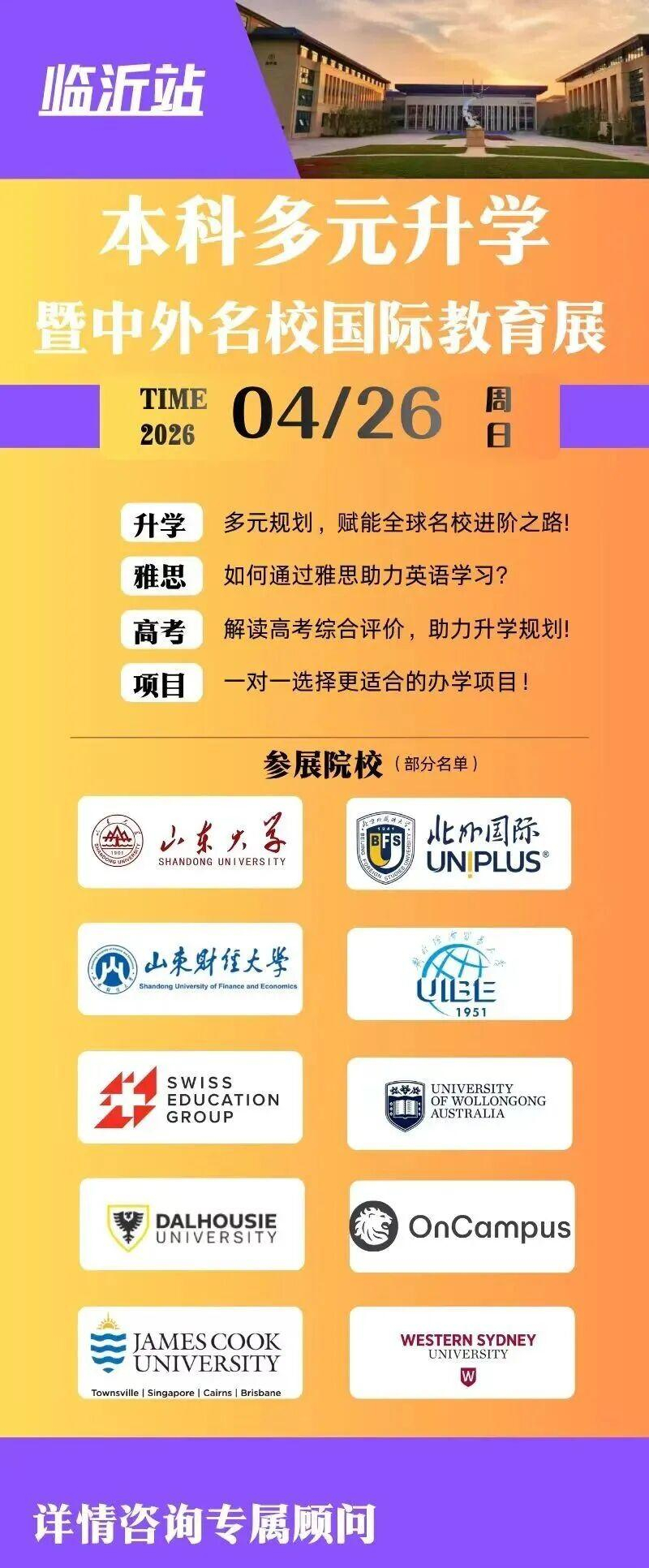 4月26日,临沂国际教育展举办,一次性逛完20+所优质海内外院校,中外合作办学项目、海外大学、海外中小学国际学校一网打尽,打破信息差,你的所有择校问题都可以在这里得到想知道的答案!