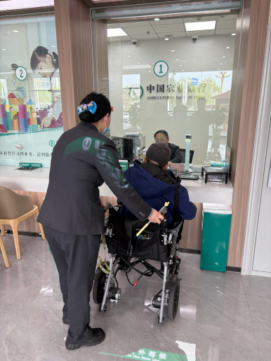 近日,一位行动不便、独自乘坐电动轮椅的客户来到农行泰安龙潭支行办理业务。网点大堂经理第一时间留意到这位特殊客户,立刻快步上前,主动帮忙推开网点大门,小心翼翼地引导客户平稳进入大厅。经询问,客户此次仅需办理100元小额取款业务,大堂经理全程贴心陪同,优先引导至爱心窗口,协助取号、填写单据,全程耐心陪伴,直至业务顺利办结。