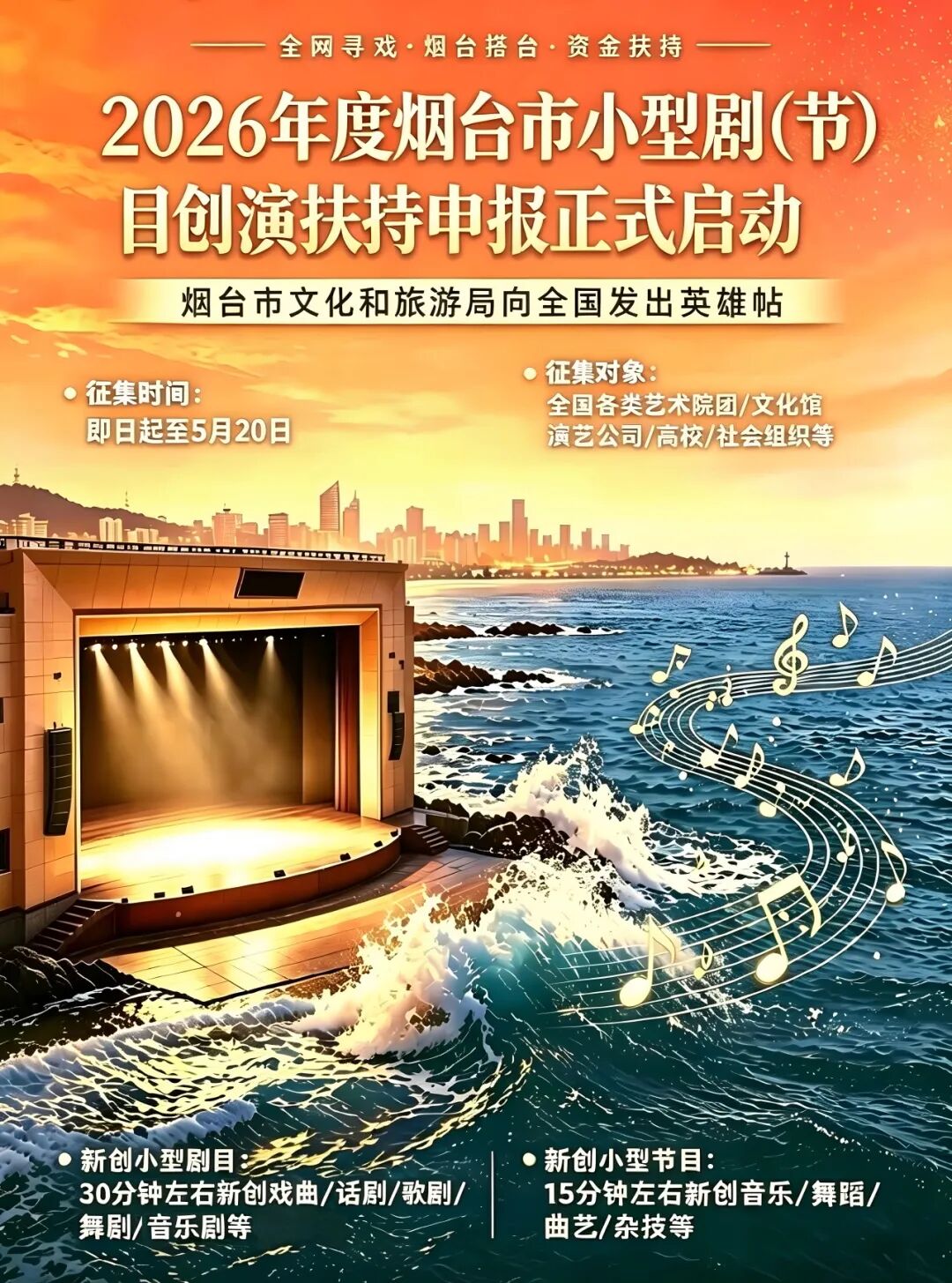 2026年度烟台市小型剧(节)目创演扶持申报正式启动!烟台市文化和旅游局向全国发出“英雄帖”!这是一次让文字立上舞台的双向奔赴!不管你是来自北上广深的资深大咖,还是身处小县城的宝藏团队,只要你的作品足够好,烟台就为你搭台、给你资金、为你喝彩!