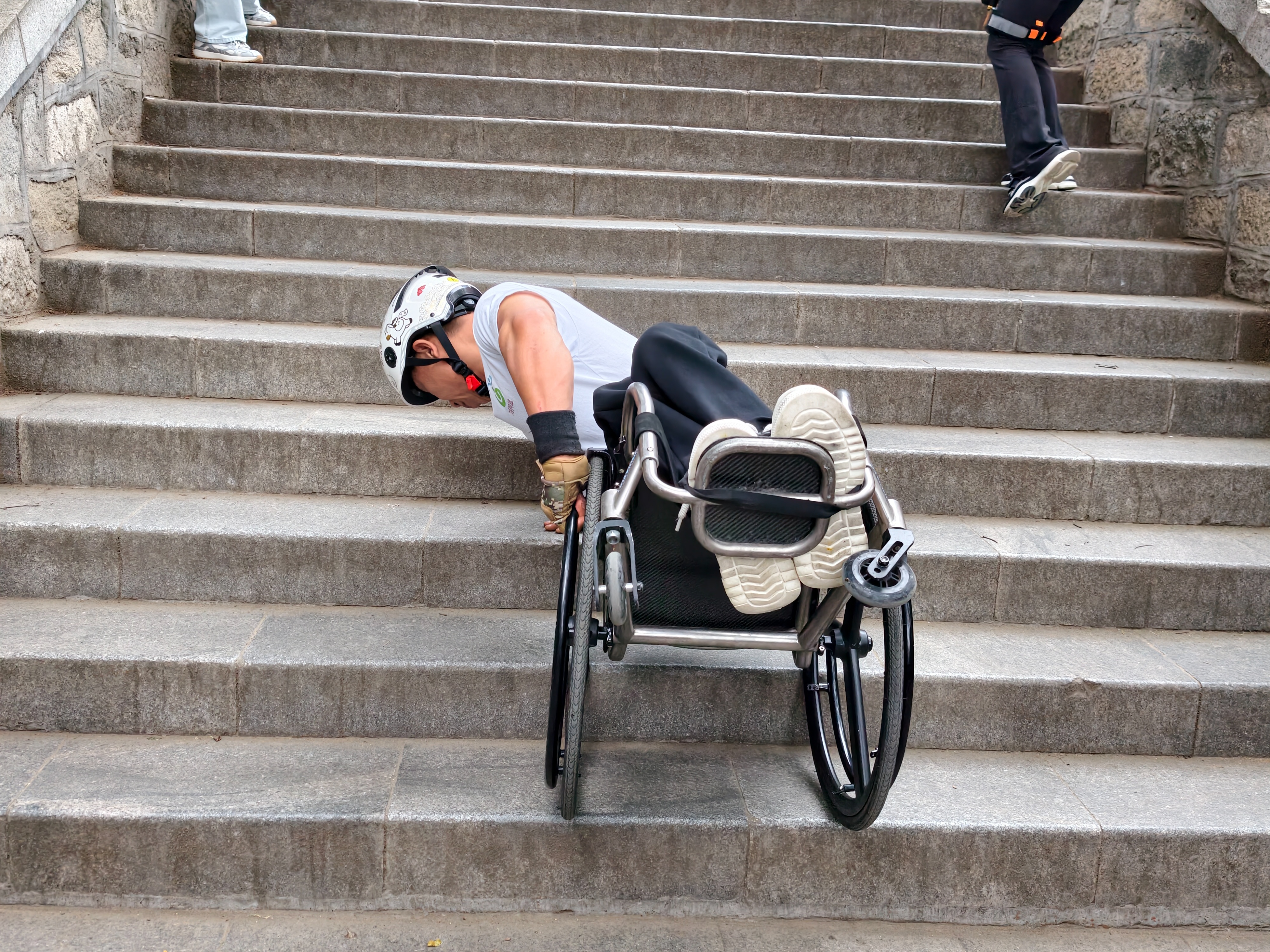 头戴安全帽、佩戴护腕手套、系好安全带,刘阿雄以一只手撑住台阶,身体前倾,依靠双臂的力量带动轮椅与身体,一级一级向上攀爬。泰山部分山势陡峭、石阶较为狭窄,对攀登者的体力与意志都是一大考验。“泰山是治嘴硬的地方,今天能爬到哪里看结果。”刘阿雄每攀爬一段便稍作休息,口中喊着“我命由我不由天”“加油”。历经约40分钟,他从关帝庙顺利攀登至万仙楼。在攀爬过程中,100多斤的身体重量全靠双臂支撑,手臂因持续发力而颤抖,但他始终没有停下脚步,不断摸索路线、破解难点,用毅力战胜每一级台阶。