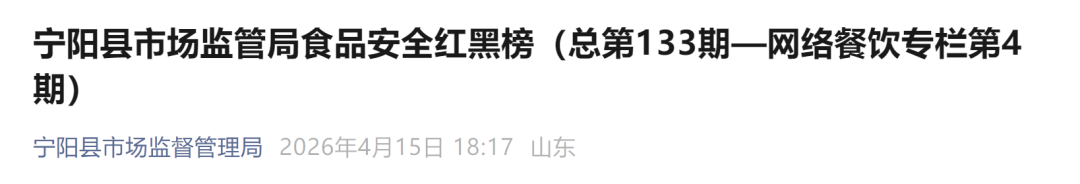 4月15日,泰安市宁阳县市场监督管理局发布食品安全红黑榜(总第133期—网络餐饮专栏第4期),具体如下:
