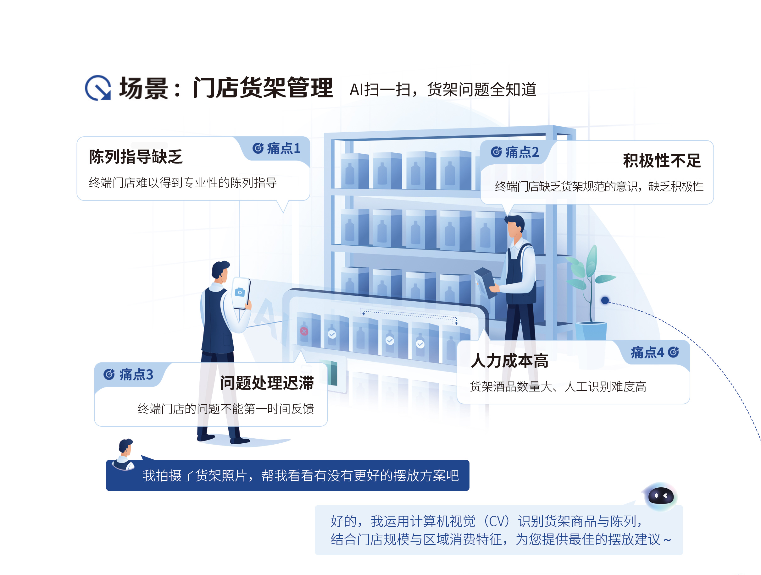 快消品的陈列位置,直接决定了产品的曝光率和销量。人的视线习惯落在中间层,底层和顶层往往是视觉盲区。过去,厂家只能派业务人员挨家挨户巡店,用肉眼判断陈列是否合理,再手工记录反馈,不仅效率低下,还容易出现虚报陈列效果的问题。