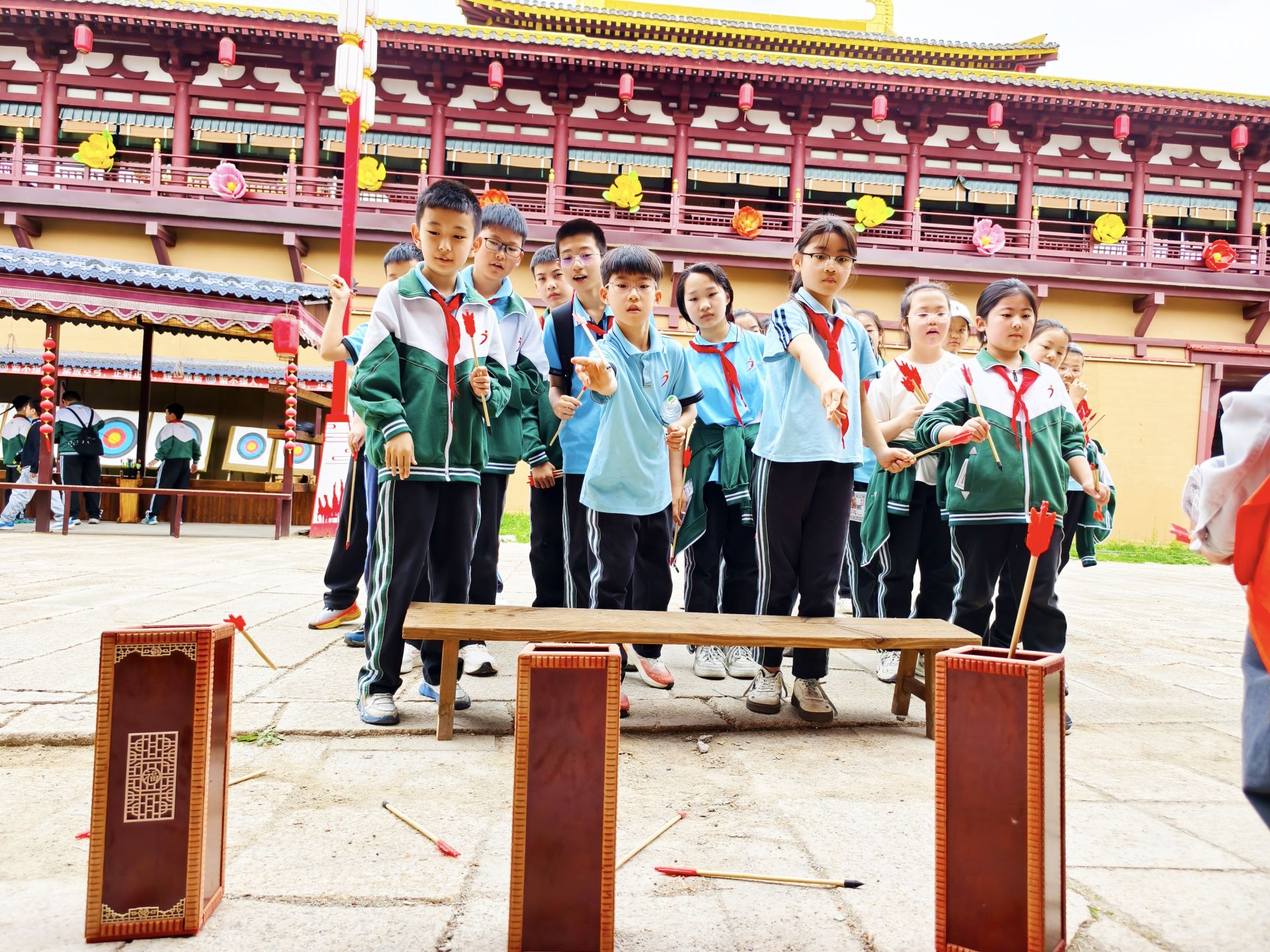 学生们走进乐陵影视城,参与射箭、投壶、猜谜语等丰富多彩的实践体验活动。孩子们在趣味互动中感受传统文化魅力,锻炼动手能力与团队协作意识,在轻松愉悦的氛围中拓宽视野、增长见识,实现了学思践悟、知行合一。