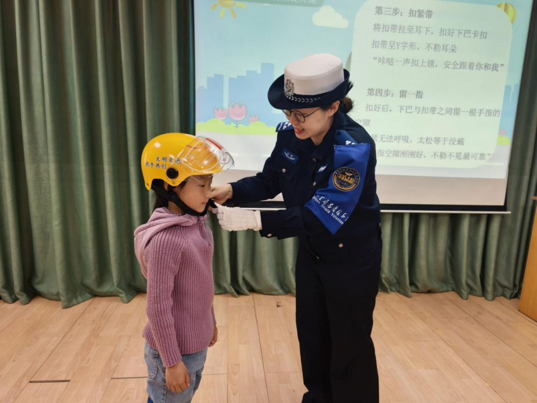 活动中,交警叔叔阿姨不再是讲台上的权威,而是“同事”与“导师”。学生们不仅学习电动车安全知识,更在互动环节中承担起“小安全员”的职责:现场学习佩戴安全头盔、参与安全隐患“找碴”游戏、争当安全知识问答的“小专家”。这种职业体验式设计,让学生从被动接受者转变为安全规则的实践者与传播者。孩子们在模拟真实场景中理解:电动车安全不是抽象的要求,而是每天出行中可感知、可操作的具体行动。