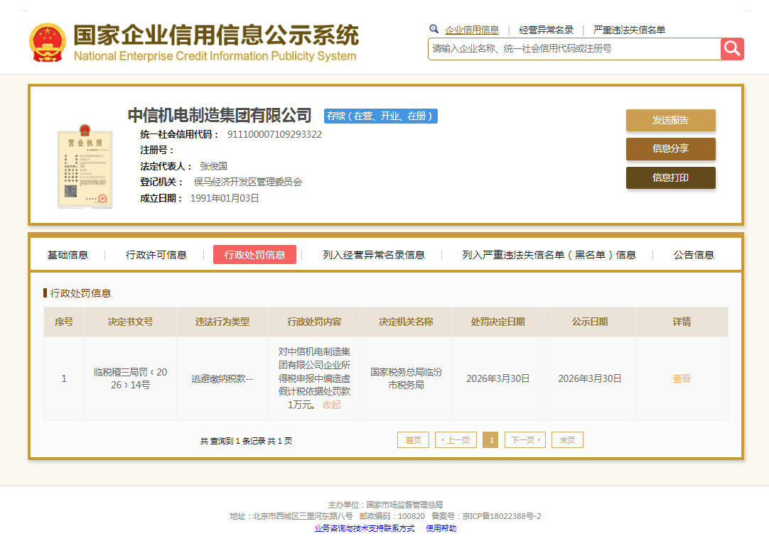 齐鲁晚报·齐鲁壹点记者于国家企业信用信息公示系统获悉,3月30日,中国中信集团旗下的中信机电制造集团有限公司(下称“中信机电制造集团”)因"逃避缴纳税款"被行政处罚,处罚机关为国家税务总局临汾市税务局。