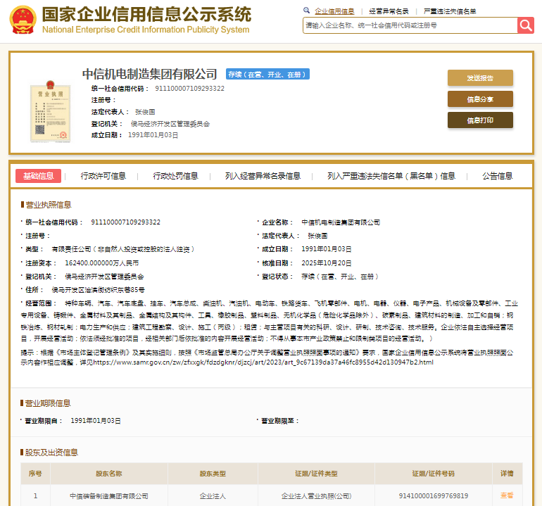 国家企业信用信息公示系统显示,中信机电制造集团有限公司成立于1991年,注册资本162400万元人民币,法定代表人为张俊国,由中国中信集团子公司——中信装备制造集团有限公司全资持股。